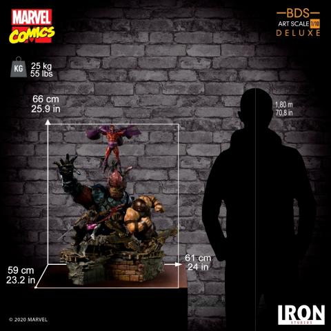 After suffering severe battle damage, the remains of a Sentinel robot crawl through rubble, manipulated like a giant puppet by the powers of Erik Magnus Lehnsherr, the mutant better known as Magneto floating over his head. Facing the destructive mechanical mace of the automaton, we have the powerful Juggernaut alongside Gambit throwing his cards fueled with kinetic energy. This scenario takes on three dimensions in Iron Studios \”X-Men vs Sentinel # 1 Deluxe BDS Art Scale 1/10 – Marvel Comics\”, produced in limited edition, made of polystone and hand painted with the figures of the Sentinel robot, Gambit, Magneto and Juggernaut (exclusive for this BDS).